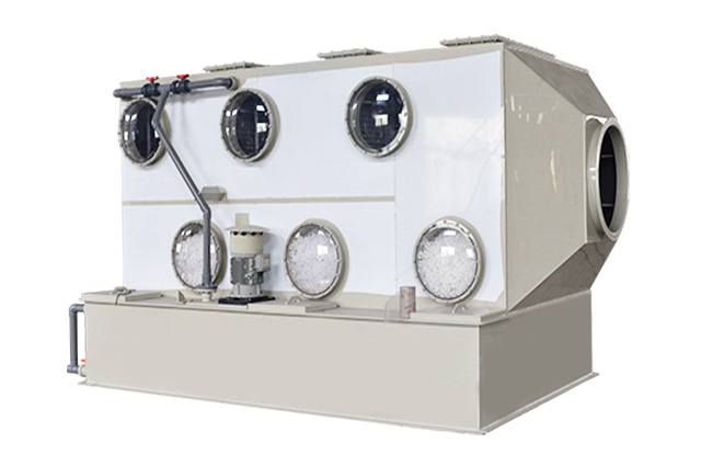 PP臥式噴淋塔也叫臥式交叉流式洗滌塔、PP臥式廢氣處理塔。臥式噴淋塔適用于空間狹小的安裝環(huán)境,多用于室內安裝??捎糜谔幚砜扇苄詺怏w、液態(tài)微粒、固粒狀物、臭氧。在工業(yè)用途上可當做冷卻塔、濕潤機,并適用于各種工程制程的廢氣處理。PP臥式噴淋塔的工作原理:有害廢氣由離心通風機壓入或吸入進風段,再流動至填料層,與噴淋液接觸反應。噴淋系統(tǒng)利用清水作為循環(huán)吸收液,循環(huán)水從塔體的上部的布水器噴淋至填料層,潤濕填料表面形成流動的液膜。PP臥式噴淋塔填料層內氣、液兩相呈逆流流動,氣液兩相在塔體內逆流接觸,利用有害氣體在吸收劑中的一定的溶解度,可溶的部分不斷融入吸收液中,達到降解氣體中有害組分含量的目的??梢赃m當的添加藥劑,有害廢氣不斷被吸收或是被化學反應去除掉,濃度在流動過程中逐漸降低,到PP臥式噴淋塔側部是達到吸收要求排出洗滌塔外。